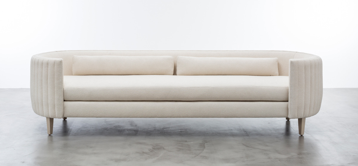 Produced under the Shine by S.H.O brand, Clarisse draws inspiration from high fashion and 1960s jewelry. A signature detail is the vertically profiled back panel, whose rhythm references Art Deco elegance in a modern interpretation. Each sofa is bench-made in California, allowing for high levels of customization.