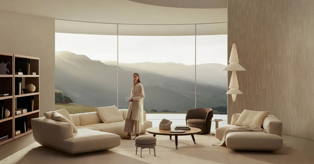 Cassina integrates circular economy principles into high-end manufacturing. The Esosoft collection, the first collaboration between Antonio Citterio and Cassina, highlights this direction.