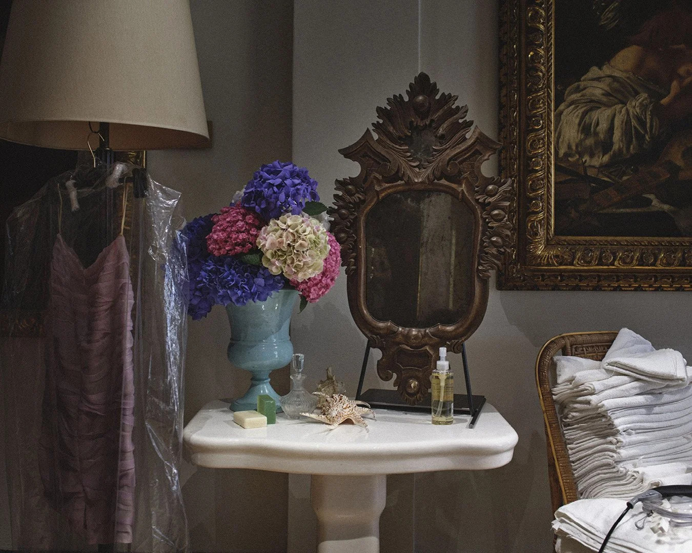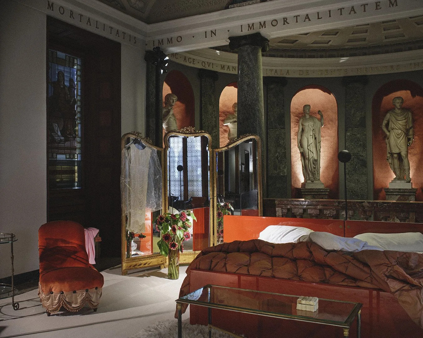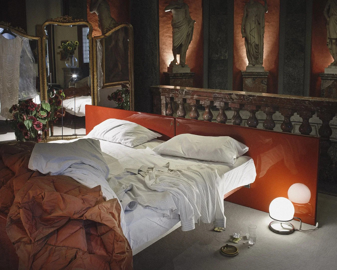 In this setting, masterpieces serve as a backdrop to a "dream of domestic life." One might see a dining table crowned with a champagne tower, mirrored corridors humming with reflection, or bedrooms scattered with yellowing papers and magazines. This atmosphere of "Lived-in Luxury" with an unmade bed or glasses left on the floor creates the cinematic effect of "the morning after a party" in a grand palazzo. It is a dialogue between the eternal (the museum’s statues and the Latin inscriptions like DABUNT AD AETERNITATEM) and the transient moments of modern life.