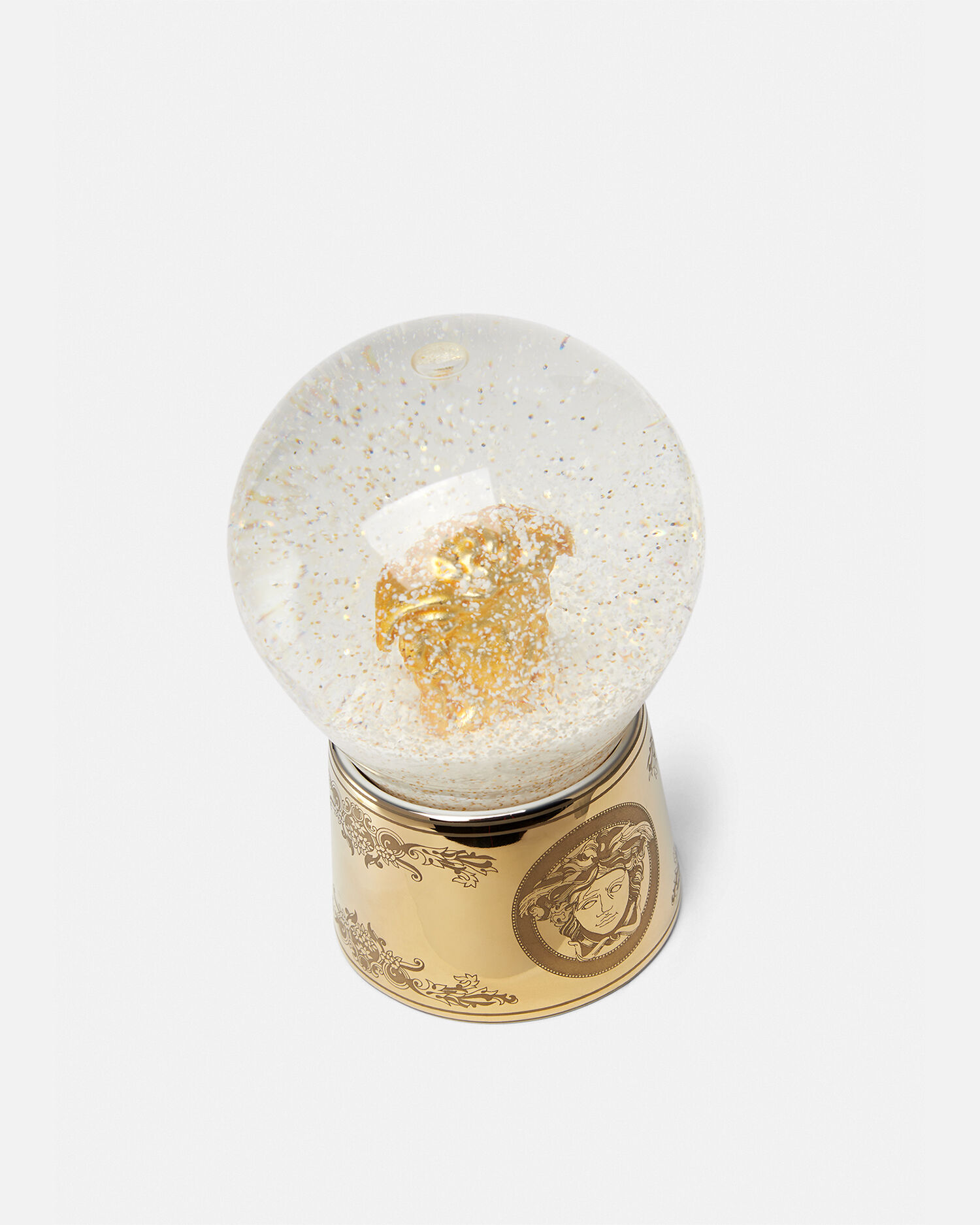 A sophisticated gift idea, this snow globe features a three-dimensional Medusa placed inside a snow-effect glass sphere. Crafted from exceptional porcelain, the gold-tone base boast a matte motif of the mythical woman framed with a Barocco border.