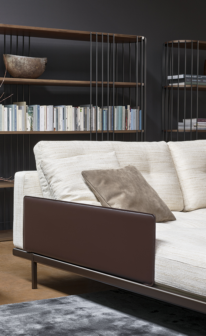 The Maximilian sofa is a lightweight base with voluminous down seat cushions, with quilted stitching characteristic of typical 1950s pieces. Rough leather accessories such as the armrest, magazine holder and coffee table are distinctive elements of the versatile, understated but very elegant concept.